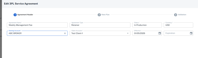 - Client Account: A client account from Engage must be selected. Currently, each individual client needs to have their own 3pl Service Agreement. You cannot add multiple clients to one retainer agreement.