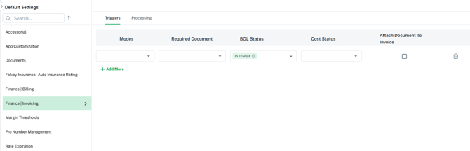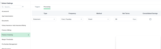 Brokers will set up their specific Triggers that will dictate the requirements to approve an Invoice. From there, brokers then set up their processing requirements which will determine when the Invoice or Statement will be generated, what information will be included, the frequency, method of communication, and net terms. See below for more insight into the Triggers and Processing settings available.