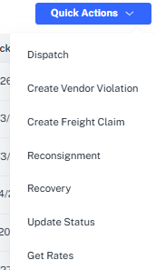 - Choose the appropriate action to take (Dispatch, Vendor Violation, Freight Claim, Reconsignment, Recovery, Update Status, Get Rates, Tender)