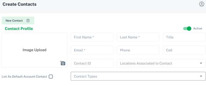 - Active toggle: Toggle will always default to Active upon Contact creation. The manual action required is only to De-activate a Contact from an Account.