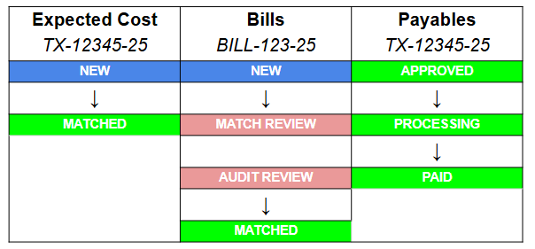 Once an expected cost record is matched to a bill (submitted manually or created via an integration), the record can be audited and eventually approved.