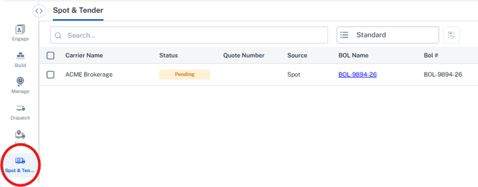 - The 'Spot & Tender' page is a collection of Spot Requests from Guest Shippers with a status of Pending. (All action by the broker must be taken via the email link to submit the rate-Future enhancements will enable additional options via the grid)