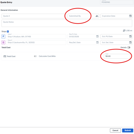 - Broker will need to enter the bid through the email link (future functionality will allow the Broker to enter the bid through the Spot & Tender grid as well). The required fields to Submit a Bid are Submitted By and Cost.