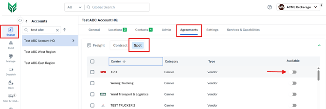 Note: By Default, a Shipper Guest will be given access to only submit a Spot to you, the Broker. To activate additional Carriers, it must be done on an account-by-account basis (Engage>Accounts>Select Shipper Account Name>Agreements>Freight>Spot>activate via the 'Availability' toggle option next to each of your Carriers).