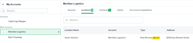 - This address is set in My Account>Locations>Bill To (as a Location Type). If multiple Locations are selected as Bill To, the system will select one (typically the first one) and allow the User to select via dropdown in the Shipment Bill To. If no Bill To Locations are selected, it will use the Default.