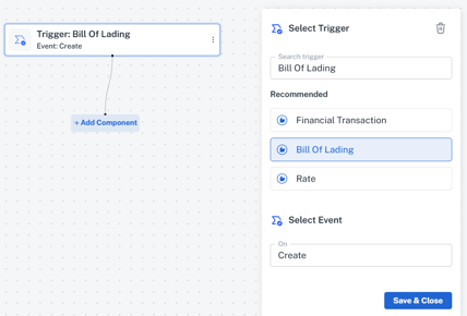 - Begin with selecting a Trigger to activate the Workflow (for example, Creating, Deleting or Updating a BOL)
